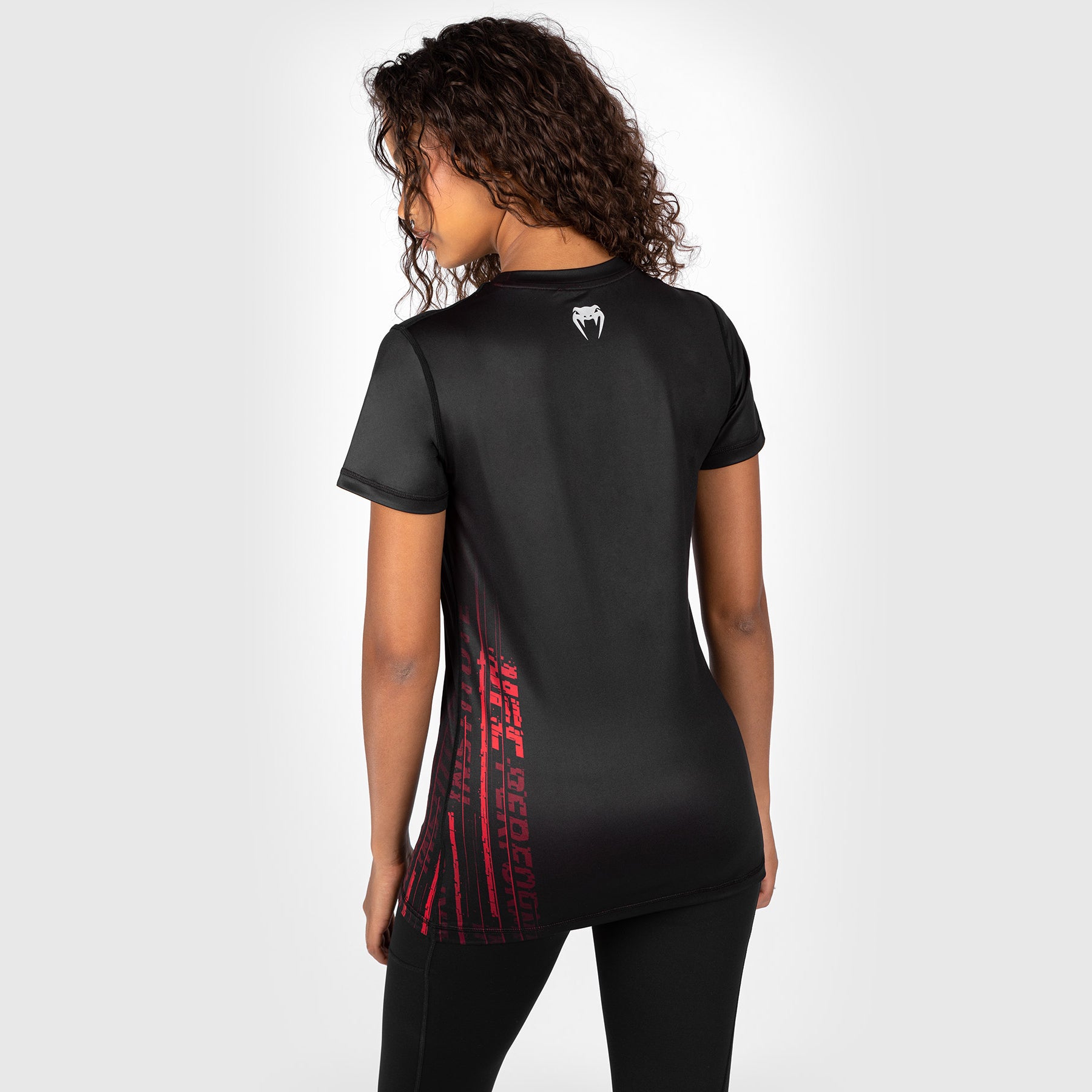 Questa maglia nera a girocollo presenta la dinamica grafica rossa della collezione sul lato sinistro e i loghi Performance Institute e Venum in grigio argento sul petto. Abbinate questa maglia al pantalone o al tight da donna per un look completo.
